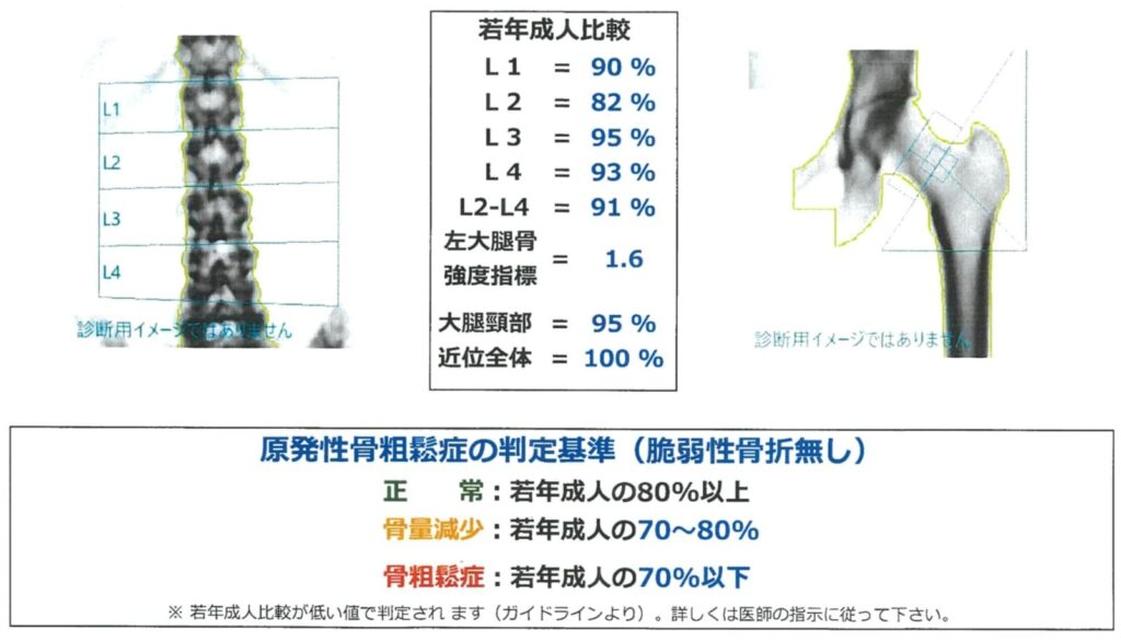 腰椎や大腿骨頸部を中心に撮影し、検査時間は約5分です。
