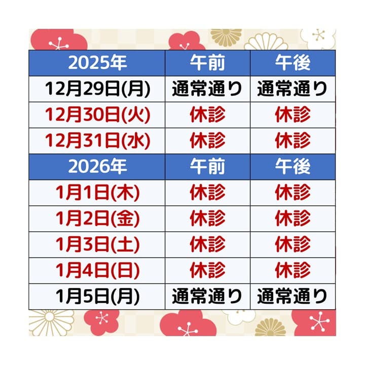 12月30日(火)~1月4日(日)まで終日休診となります。