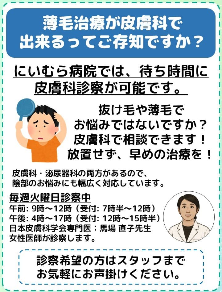 泌尿器科外来の待ち時間に皮膚科診察可能です。